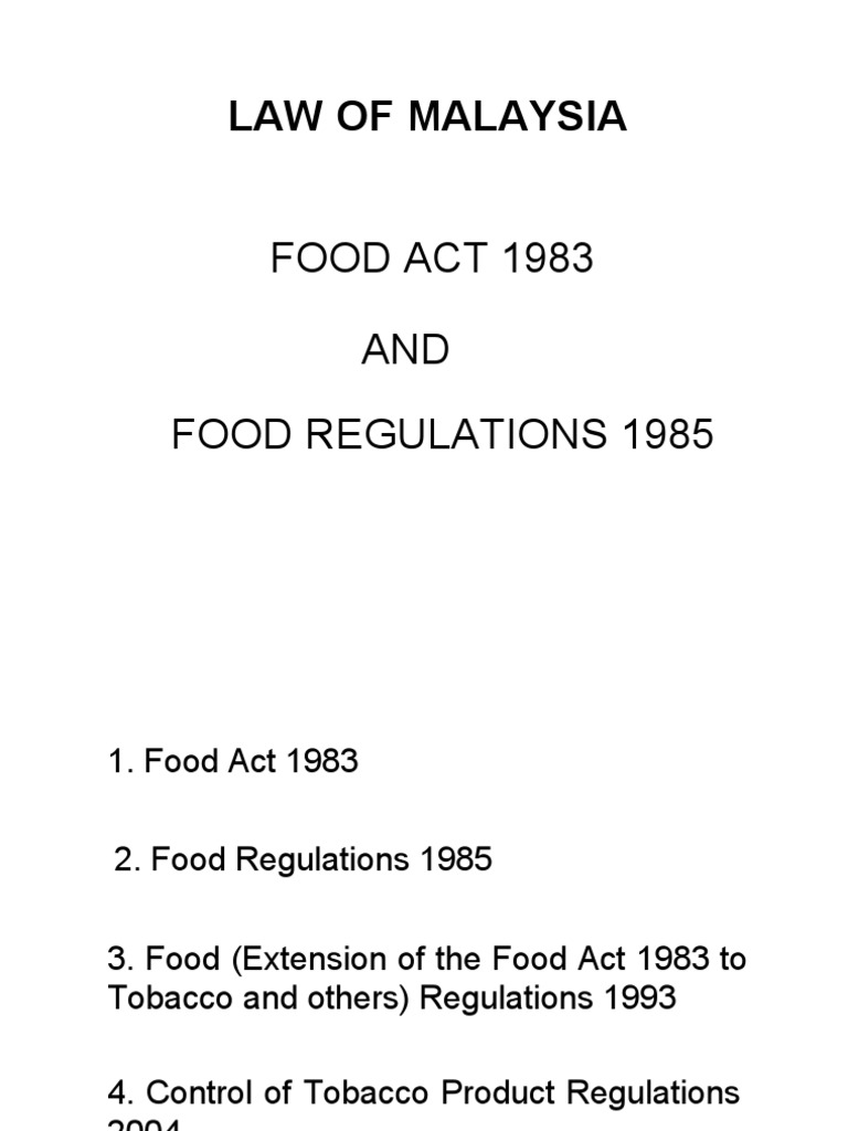The food act 1983 and the food regulations 1985 of malaysia govern the various aspects of food safety and quality control including food standards, food hygiene, food import and export, food advertisement and accreditation of laboratories. And, food regulations 1985 : Malaysia has realized that food safety can no longer be considered solely as a domestic entity nor can it be the responsibility of a single agency. All amendments up to january, 1994 as want to read This is a list of acts of the parliament of malaysia.