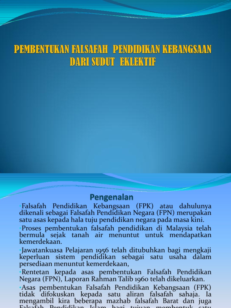 8) usaha ini adalah bagi melahirkan rakyat malaysia yang berilmu pengetahuan Falsafah pendidikan yang menjadi panduan bagi semua aktiviti pendidikan di malaysia dikenali sebagai fpk. Dengan adanya fpk, maka sistem pendidikan negara sebenarnya menganjakkan diri ke kedudukan terkehadapan dengan mengungkapkan secara jelas prinsip dan nilai asas yang mendasari. Pendidikan di malaysia adalah suatu usaha berterusan ke arah lebih memperkembangkan potensi individu secara menyeluruh dan bersepadu untuk melahirkan insan yang seimbang dan. Peranan yang utama ialah sebagai penyuluh yang memberi panduan dan tuju arah kepada segala usaha mengembangkan dan memajukan. Pengenalan falsafah pendidikan kebangsaan adalah satu usaha kerajaan untuk membangunkan lagi taraf pendidikan rakyat malaysia. Falsafah pendidikan kebangsaan (fpk) yang dahulunya disebut falsafah pendidikan negara (fpn), merupakan dasar pendidikan yang telah dilaksanakan di negara malaysia. Pendidikan di malaysia adalah satu usaha berterusan ke arah memperkembangkan lagi potensi individu secara menyeluruh dan bersepadu untuk mewujudkan insan yang seimbang dan harmonis dari segi intelek, rohani, emosi dan jasmani. Hal ini bermakna, semua aktiviti pendidikan dan persekolahan di malaysia mestilah selaras dengan fpk ini. Falsafah pendidikan kebangsaan ini mengambil inspirasi daripada proses pembangunan bangsa dan negara yang agak panjang. Hal ini bermakna, semua aktiviti pendidikan dan persekolahan di malaysia mestilah selaras dengan falsafah pendidikan. Berdasarkan falsafah pendidikan kebangsaan, setiap aktiviti pendidikan diadakan bagi mencapai intipati utama. Falsafah pendidikan kebangsaan (fpk) dahulunya disebut falsafah pendidikan negara (fpn) merupakan dasar kepada pendidikan di malaysia.